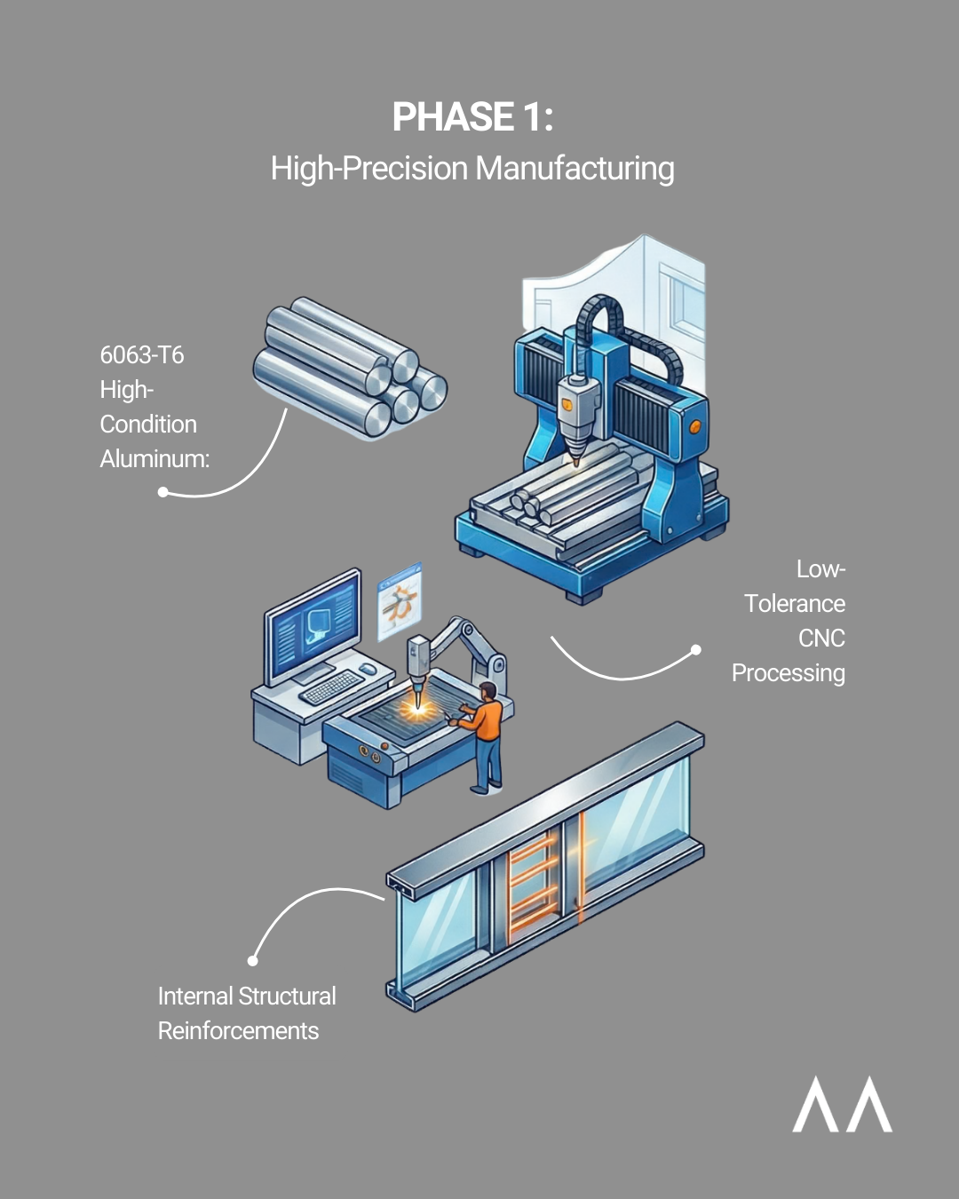 The manufacturing process begins with the selection of high-condition 6063-T6 aluminum profiles, engineered to withstand Virginia’s strong winds and environmental conditions.
