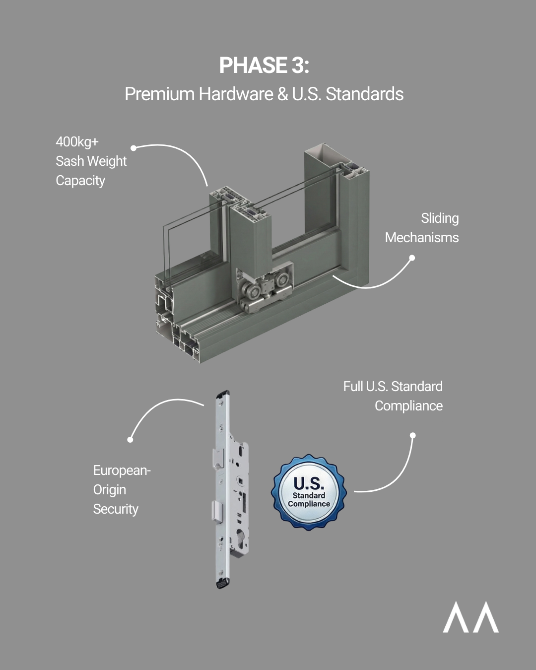 Each sash is fitted with European-origin multi-point locking mechanisms, factory-tested prior to shipment. This ensures both security and long-term operational reliability.