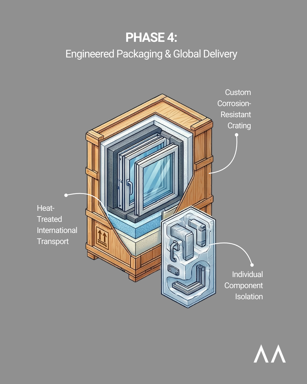 To prevent any deformation or surface damage during overseas transit, each system is packed in custom-engineered, heat-treated wooden crates. Sensitive components and corner joints are further protected with high-density materials to ensure factory-to-site integrity.