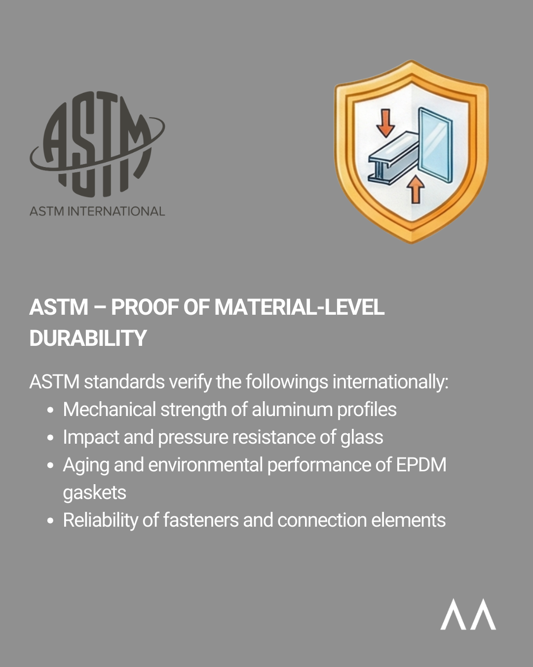 ASTM focuses on material-level testing, including aluminum profiles, glass, EPDM gaskets, and fasteners. These tests validate durability, mechanical strength, and environmental resistance of individual components.