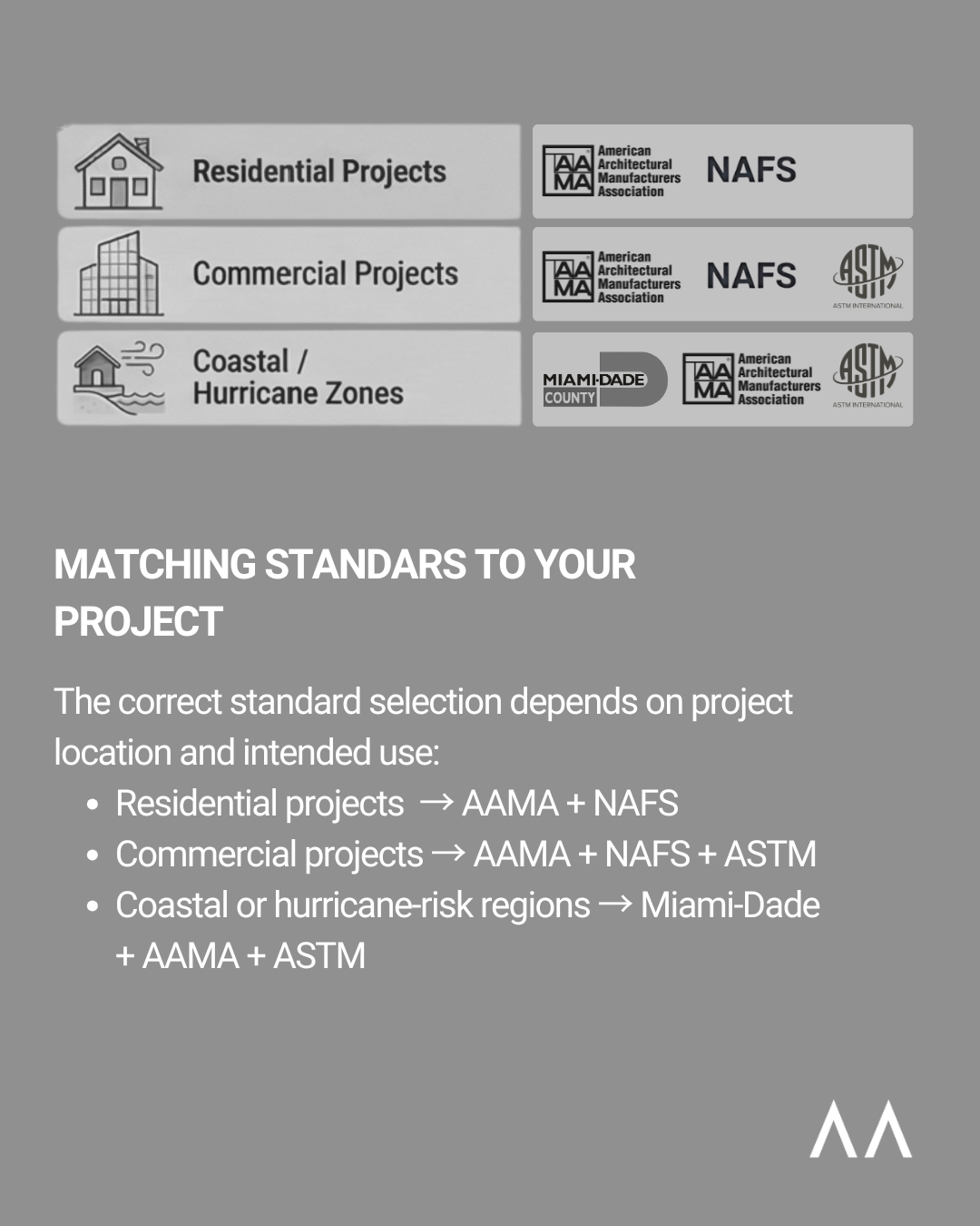 Commercial projects → AAMA + NAFS + ASTM